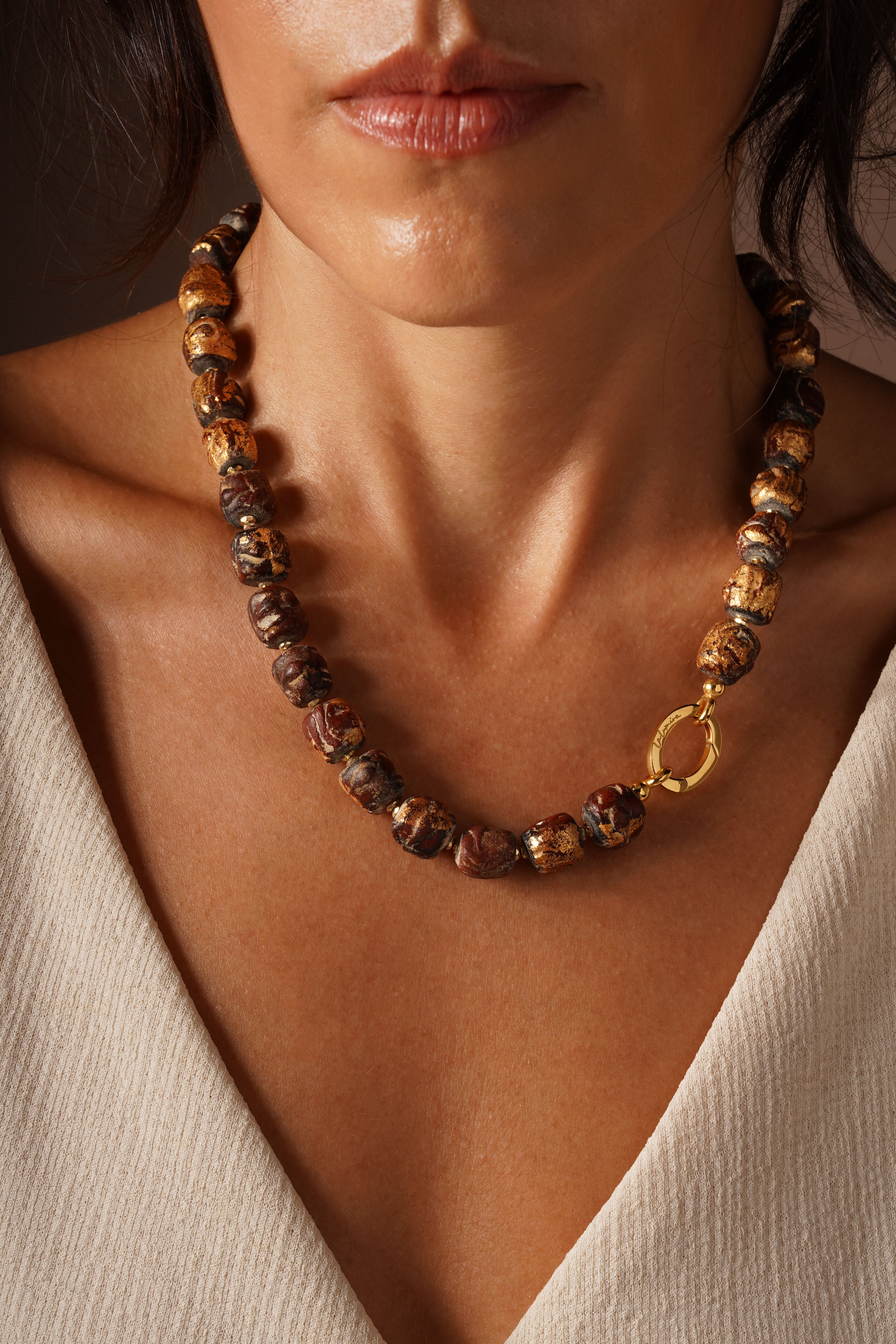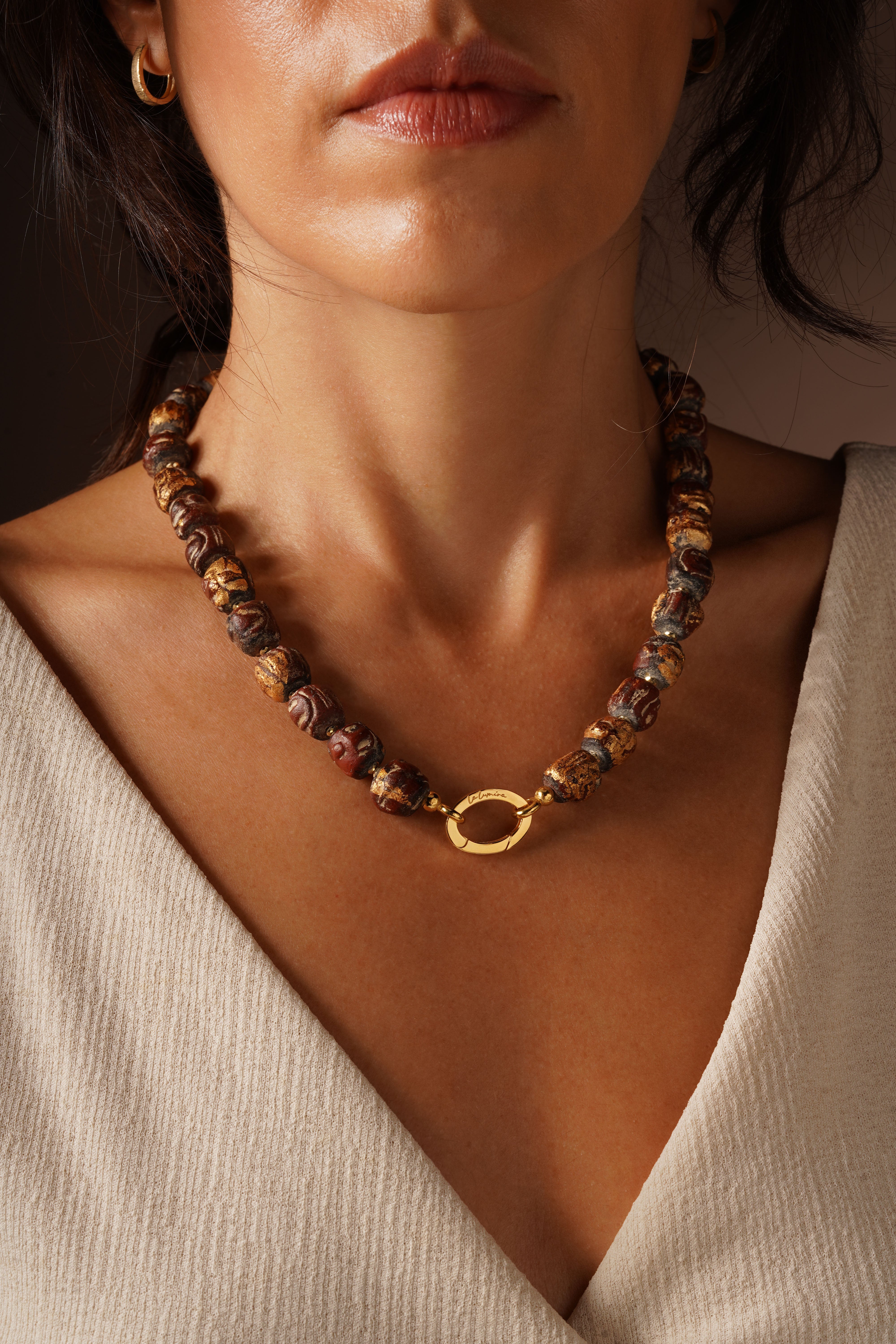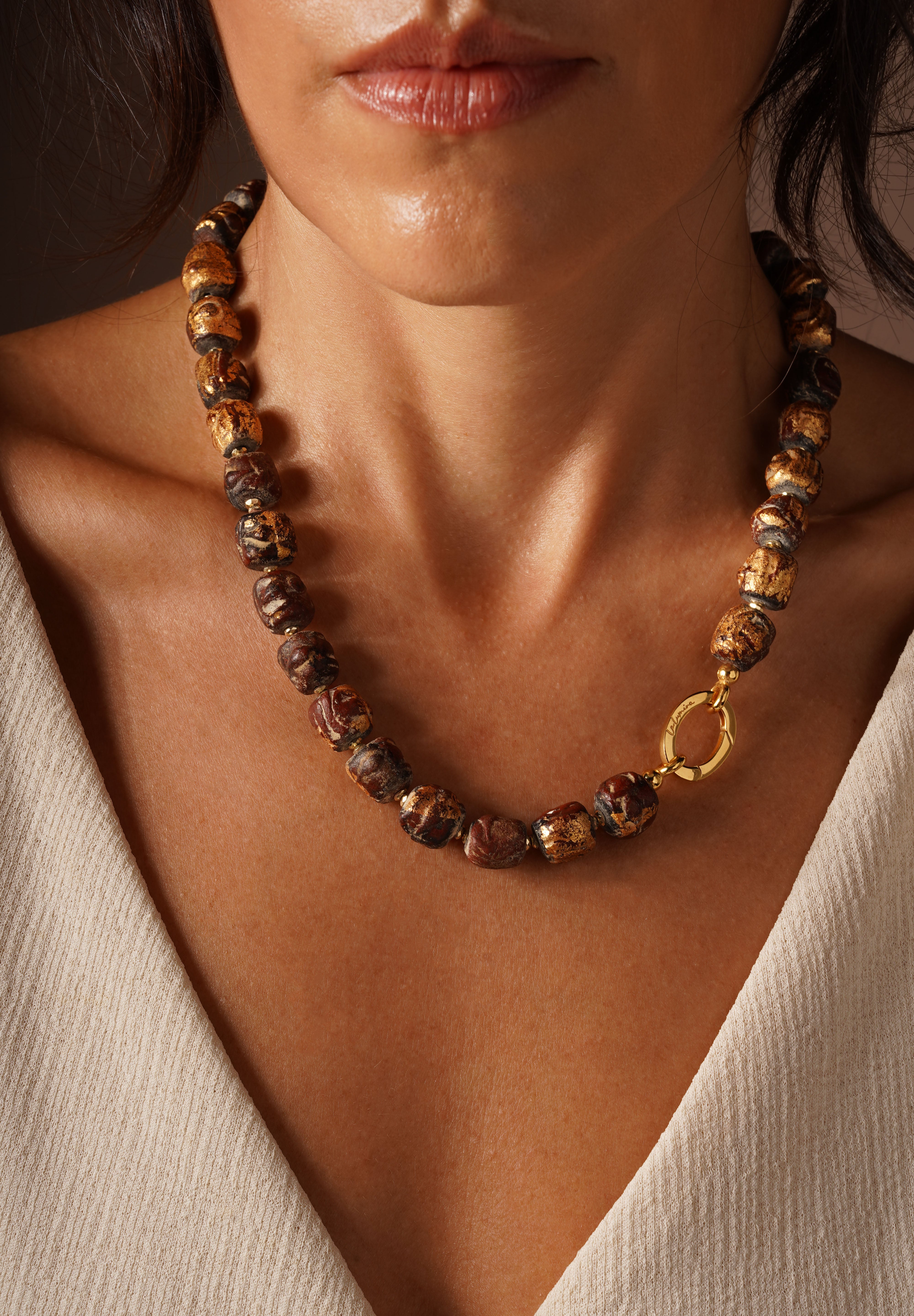 La Lumira bu organik formları altın tozu ile işleyerek taşın zarafetini yeniden tanımlar.