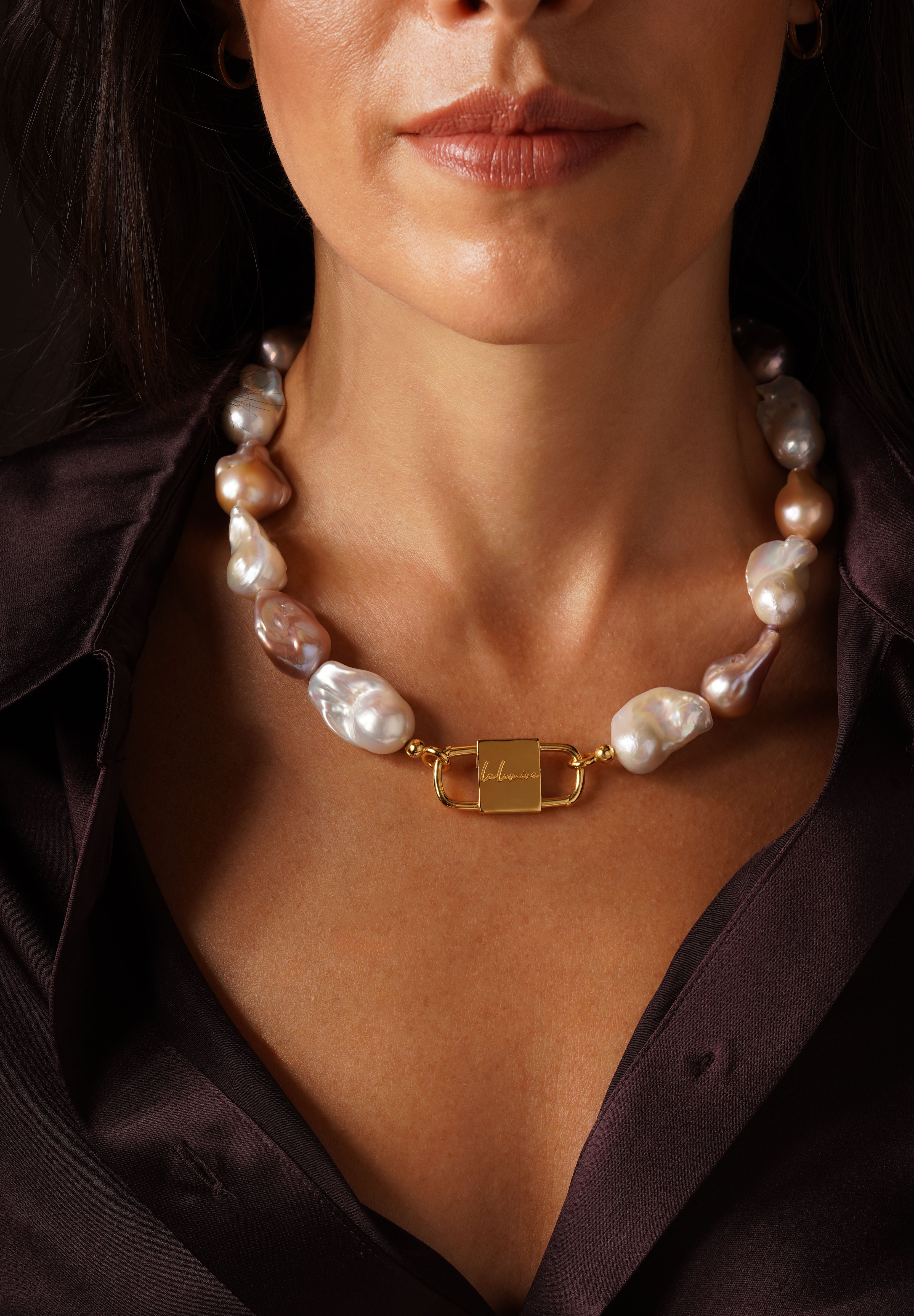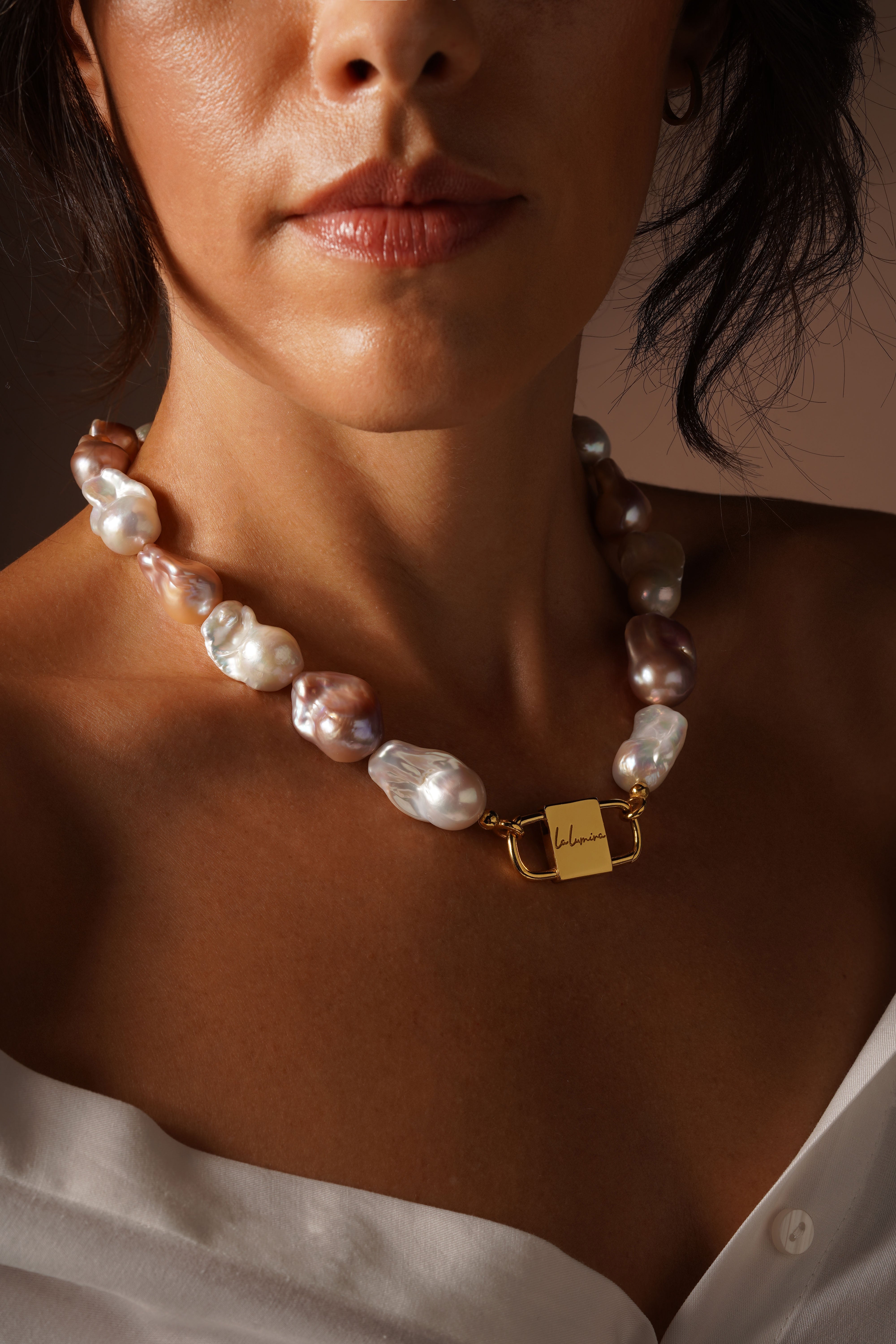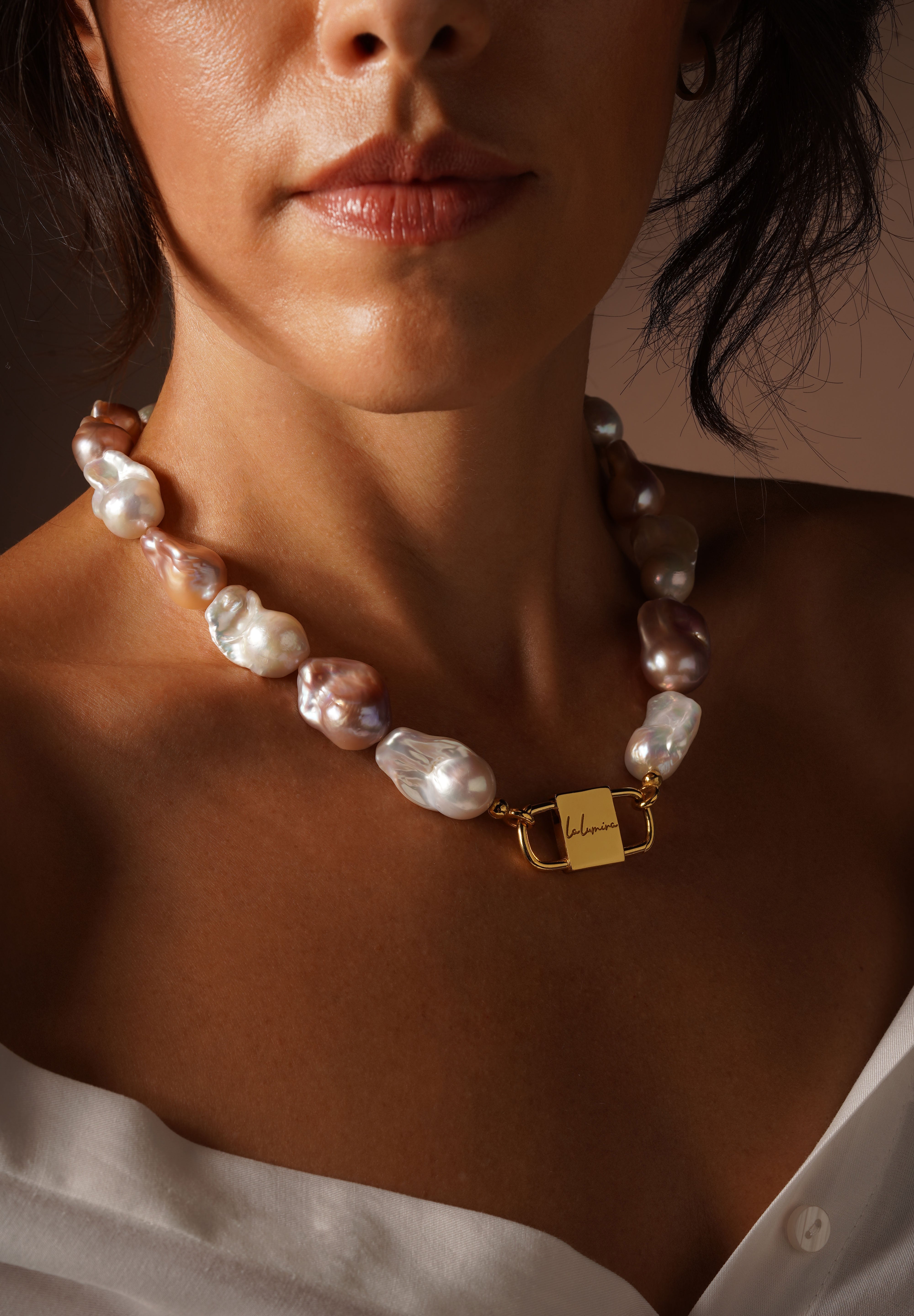 Nature’s Gems koleksiyonundaki bu tasarım, renkli barok incilerin zarif ışıltısını modern bir formda yorumlar. Her inci, tonu ve parlaklığına göre özenle seçilmiş; kompozisyon La Signature Lock ile tamamlanarak zamansız bir bütünlük kazanmıştır.