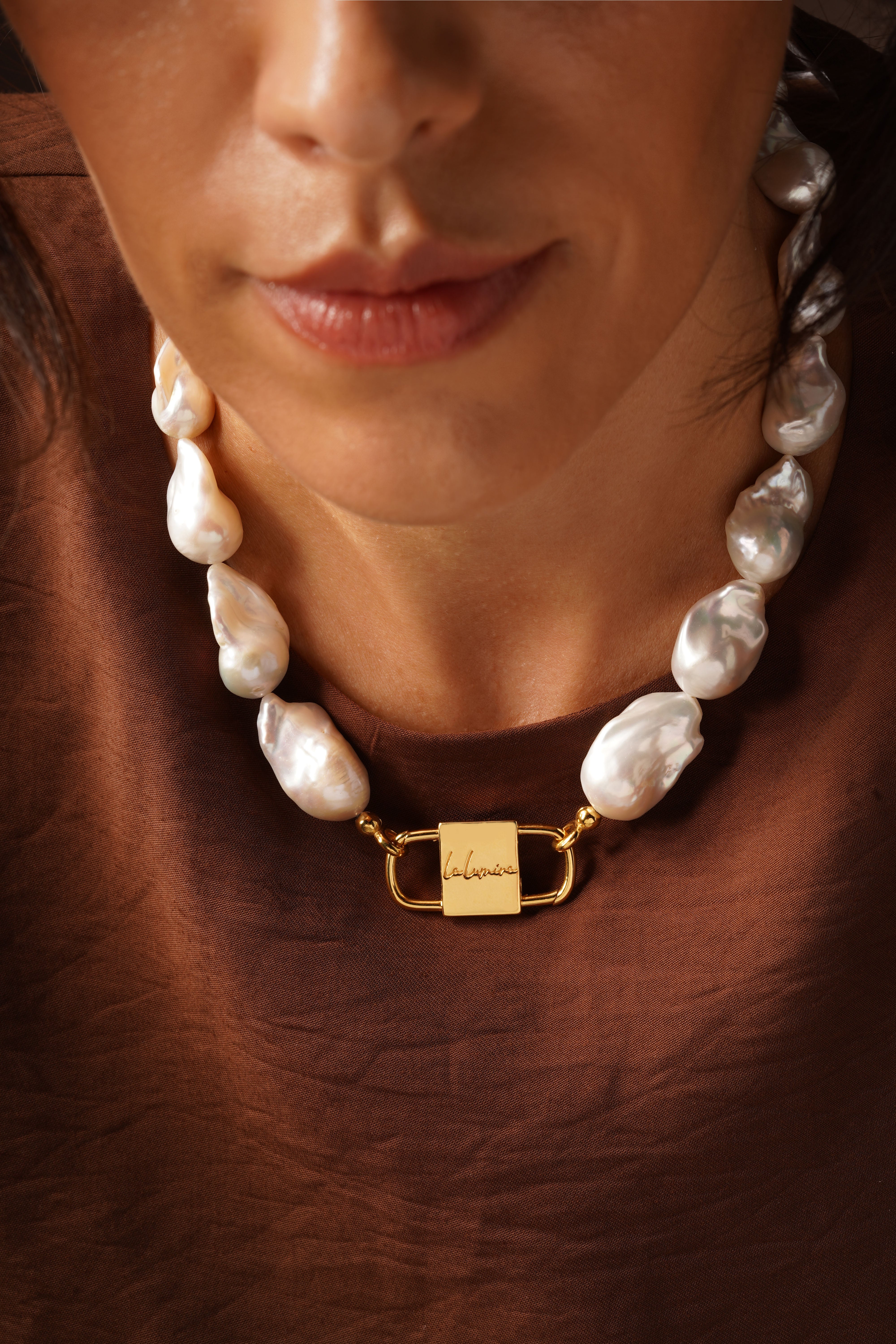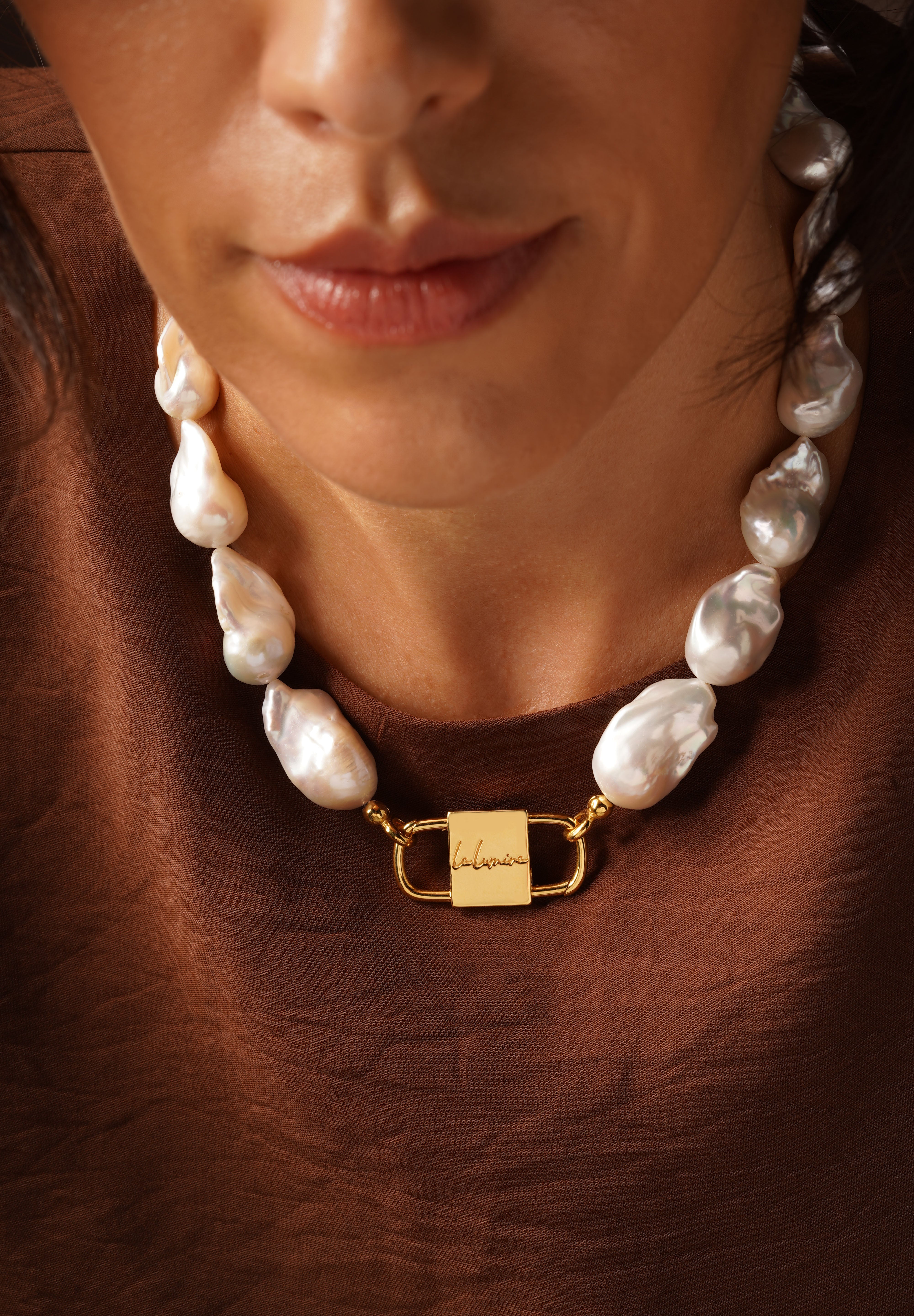 Nature’s Gems koleksiyonundaki bu tasarım, barok incinin sade ama ışıltılı doğasını modern bir formda yorumlar. Her inci özenle seçilmiş, kompozisyon La Signature Lock ile tamamlanarak zamansız bir bütünlük kazanmıştır.